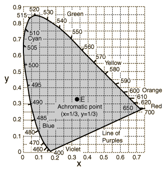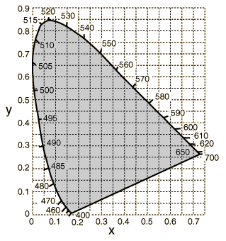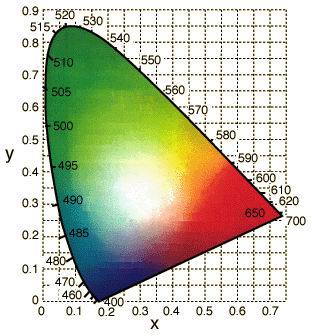 One characteristic of the commonly used 1931 CIE Chromaticity Diagram that is evident even from this crude portrayal is that the green takes up far too much of the landscape compared to the number of visually different colors in the region. That was one of the shortcomings that the 1960 and 1976 revisions sought to address.