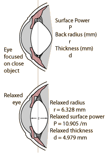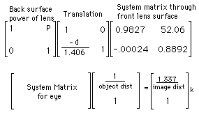 By computing the system matrix for the entire imaging process, constraining the image to fall on the retina, the object distance on which the eye is focused can be calculated. (If an image is to be formed, the object distance must be negative since the Cartesian sign convention is used.) Alternatively, by choosing and object distance, the required back surface power can be calculated.