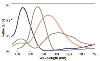 At right is a qualitative sketch of the measured reflectivity of four different regions of a peacock feather as a function of wavelength. The sketch is adapted from data by Zi, et al., taken with normally incident light. They investigated the differences in structure of the different colored regions and concluded that reflections from the front and back of the structures acted like a Fabry-Perot interference device to enhance color in a specific wavelength range. |