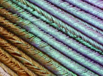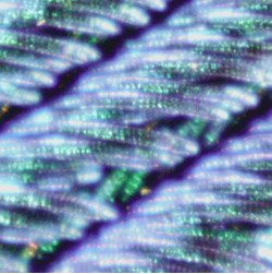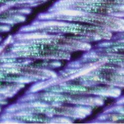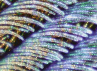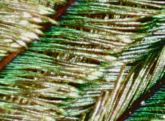 At 100x the variations in the filaments are more evident. You can also begin to see why the colors seem to shimmer. The visible color will be different at different angles of view. The structures which produce the colors are described as arrays of melanin cylinders which in a green region were measured to have an array spacing of about 150 nm. The surface of the barbule is made of keratin, containing about 10 rows of the melanin cylinders in the green region.