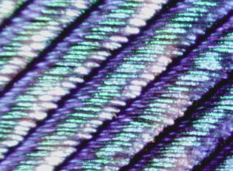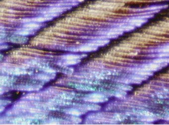 This image and the two below show subtle variations in color as well as areas which seem to "fire" with more reflected intensity than neighboring regions. Irridescence in the colored regions is taken as evidence of color which is structural in its origin, as opposed to pigment color.