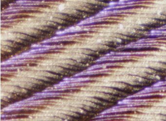 The rows of colored elements become apparent in this image taken as 50x with a ProScope. These "barbules" contain nanoscale photonic lattices according to the researchers.