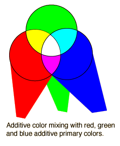 Almost all visible colors can be obtained by the additive color mixing of three colors that are in widely spaced regions of the visible spectrum. If the three colors of light can be mixed to produce white, they are called primary colors and the standard additive primary colors are red, green and blue.