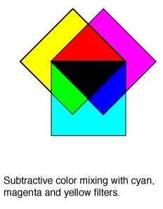 Two colors that produce white when added together are called complementary. The color complementary to a primary color is called a secondary color. The complementary or secondary colors for red, green and blue are cyan, magenta and yellow respectively. These three colors are often referred to as the subtractive primary colors. When the three are combined in subtractive color mixing, they produce black.