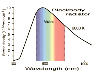 | The iradiance outside the atmosphere can be compared with the blackbody curve at 6000K, a portion of which is reproduced at right. By examining the 400-700 nm nominal range of visible light, you can see that the solar irradiance is similar to that of a blackbody radiator. The curve at the surface is noticeably flatter, or more "white" if you take equal energy per wavelength as a definition of white. |  |