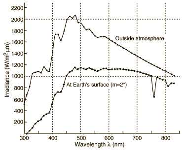 This is a plot of the standard NASA data for the spectral irradiance of the solar disk in Watts/m2mm. The upper curve is formed by joining the data points for data outside the atmosphere. The lower curve is attributed to the Earth's surface under the condition described as "air mass 2". This designation corresponds to an angle of 60° between the zenith and the Sun. The data for the surface is from Brandhorst, et al.,Interim solar cell testing procedures for terrestrial applications, NASA Rep. TM X-71771 (Lewis Research Center) 1975. The points are actually calculated using the data from outside the atmosphere assuming a water content of 20 mmHg and ozone 3.4 mm Hg. The data for outside the atmosphere is from Thekaekara, M. P., Solar energy outside the earth's atmosphere, Solar Energy 14, 109 (1973).