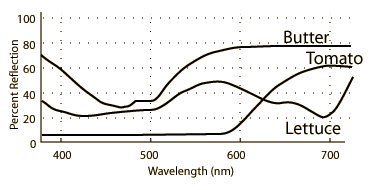 Example of Spectral Power Distribution ApplicationAn example of the spectral power distribution of light from common objects shows that such colors arise from a range of wavelengths. Even the vivid red of a tomato involves a range of wavelengths in the red region of the visible spectrum. ![]() After Williamson and Cummins, who cite General Electric Company Publication TP119, "Light and Color" for the data.