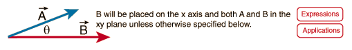 Scalar Product CalculationYou may enter values in any of the boxes below. Then click on the symbol for either the scalar product or the angle. The vectors A and B cannot be unambiguously calculated from the scalar product and the angle. If the angle is changed, then B will be placed along the x-axis and A in the xy plane.