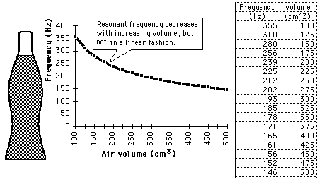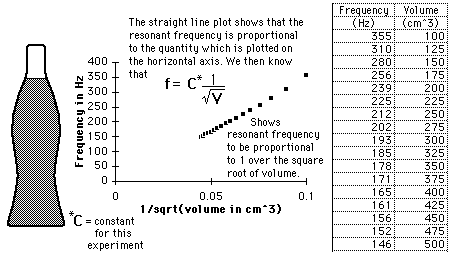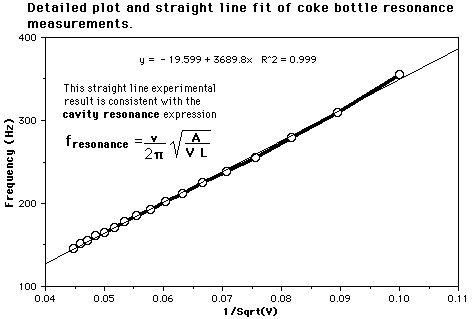 Coke Bottle ResonanceThe cavity resonance frequencies of a 0.5 liter glass coke bottle were recorded by blowing over the top of it and measuring the frequency using a microphone and a digital frequency counter. ![]()