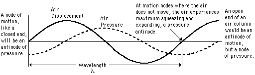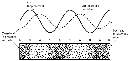 The standing waves associated with resonance in air columns have been discussed mainly in terms of the displacement of air in the columns. They can also be visualized in terms of the pressure variations in the column. A node for displacement is always an antinode for pressure and vice versa, as illustrated below. When the air is constrained to a node, the air motion will be alternately squeezing toward that point and expanding away from it, causing the pressure variation to be at a maximum. This view of resonant modes in terms of pressure waves makes it easier to see why the mouthpiece end of a wind instrument is a node for the resonances. For example, the clarinet is acoustically a closed-end cylindrical air column because the mouthpiece end acts as a pressure antinode.