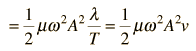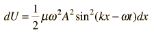 Energy in a String WaveThe energy associated with a traveling wave in a stretched string is conveniently expressed as the energy per wavelength. ![]() The energy of a small segment of the string can be expressed as the sum of the kinetic energy and elastic potential energy of the segment. The differential form of the elastic potential energy is ![]() Using the description of a traveling wave ![]() the potential energy expression becomes ![]() The energy for a full wavelength can be found by integrating this expression at a given time, and it is most convenient to set t=0 for this integration. The energy for one wavelength along the string is ![]() The differential kinetic energy is ![]() Using the velocity expression ![]() the kinetic energy takes the form ![]() and again setting t=0 for simplification ![]() The total energy associated with a wavelength is ![]() Since this amount of energy is transported a distance of one wavelength along the string in one period, this expression can be used to calculate the power transmitted along a string.