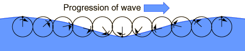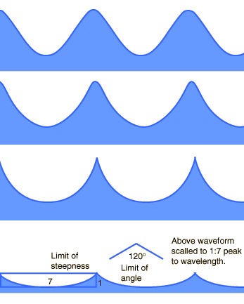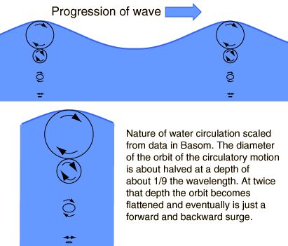 ![]() Any such simplified treatment of ocean waves is going to be inadequate to describe the complexity of the subject. It is certainly a subject that has been studied thoroughly, but no single model is going to apply to all cases. Some of the things that have been learned will be summarized here. It will be presumed that ocean waves obey the basic wave relationship c=fλ , where c is traditionally used for the wave speed or "celerity". The term celerity means the speed of the progressing wave with respect to stationary water - so any current or other net water velocity would be added to it. The shape of an ocean wave is often depicted as a sine wave, but the the experimental waveshape is described as a "trochoid". A trochoid can be defined as the curve traced out by a point on a circle as the circle is rolled along a line. The following sketch is adapted from Bascom. ![]() The trochoid shape does approach the sine curve in shape for small amplitudes, but you can perhaps see that the shape is different, with a narrowing of the peaks of the trochoid compared to the sinusoid. This narrowing or steepening of the peak becomes more pronounced as the wave amplitude increases. The discovery of the trochoidal shape came from the observation that particles in the water would execute a circular motion as a wave passed without significant net advance in their position. The motion of the water is forward as the peak of the wave passes, but backward as the trough of the wave passes, arriving again at the same position when the next peak arrives. (Actually, experiments show a slight advance of the water with the waves, but that advance is small compared to the overall circular motion.) ![]() The illustration above, adapted from von Arx, shows the direction of the water motion at different points along the wave. ![]() Bascom describes wavetank experiments where the circulation of the water was studied. The circles summarize the total motion of the medium when a full wavelength passes. It was common practice to inject droplets of oil which were whitened with zinc oxide and adjusted to have the same density as the water. The orbits could then be traced out on the sides of the wavetank. It was found that there was a small progression of the orbits in the direction of the wave propagation. The fact that the water motion at depth flattens into a forward and backward surge is readily observed by scuba divers on shallow reefs. The effect of waves traveling overhead is translated into forward and backward motion of a diver suspended over the reef, and can be seen in the motion of soft corals and vegetation. All of the description of waves above applies to long-wavelength waves which von Arx calls "gravity waves", implying that they are mainly controlled by gravity and inertia. Their wave speeds increase with wavelength, a behavior that is called "normal dispersion". For waves shorter than 1.73 cm, the surface tension of the water exerts a controlling force and von Arx calls them "capillary waves". Their speed increases as the wavelength gets shorter, a behavior that is called "anomalous dispersion". The minimum wavespeed at wavelength 1.73 cm is 23.1 cm/s. The following dependence of deep-water speed on wavelength is adapted from von Arx. ![]() The small ripples or capillary waves are observed first when a fresh wind blows over smooth water. They have rounded crests and v-shaped troughs. Von Arx describes these waves as the way the wind gets a "grip" on the water since they are numerous and move slowly before the wind. Stories are told of seafarers who first observed these capillary waves when the wind was rising and later experienced the swells of the gravity waves, so it was thought that the capillary waves were the first mechanism by which the wind gave energy to the water. As the gravity waves build up, their wavelength tends to lengthen and speed increase until it matches the speed of the wind, at which point they can no longer extract energy from the wind. The trochoid form that is attributed to ocean waves changes shape as the amplitude increases for a given wavelength.
