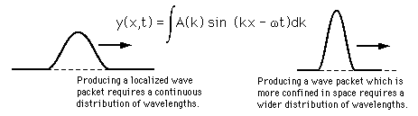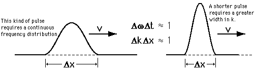 Wave Packet DetailsA wave packet solution to the wave equation, like a pulse on a string, must contain a range of frequencies. The shorter the pulse in time, the greater the range of frequency components required for the fast transient behavior. This requirement can be stated as a kind of uncertainty principle for classical waves: ![]() The actual numbers involved depend upon the definition of the pulse width, but creating short pulses inherently requires a large frequency bandwidth. This is similar in nature to the uncertainty principle in quantum mechanics.