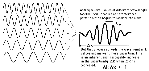 Wave Packets from Discrete WavesIf discrete traveling wave solutions to the wave equation are combined, they can be used to create a wave packet which begins to localize the wave. This property of classical waves in mirrored in the quantum mechanical uncertainty principle. ![]() |