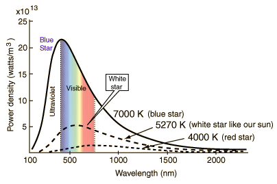 Star TemperaturesStars approximate blackbody radiators and their visible color depends upon the temperature of the radiator. The curves show blue, white, and red stars. The white star is adjusted to 5270K so that the peak of its blackbody curve is at the peak wavelength of the sun, 550 nm. From the wavelength at the peak, the temperature can be deduced from the Wien displacement law.![]() The change in the visual color of stars of different temperatures can be traced out on a chromaticity diagram. Star classification |