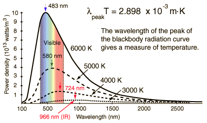 Wien's Displacement LawWhen the temperature of a blackbody radiator increases, the overall radiated energy increases and the peak of the radiation curve moves to shorter wavelengths. When the maximum is evaluated from the Planck radiation formula, the product of the peak wavelength and the temperature is found to be a constant.![]()