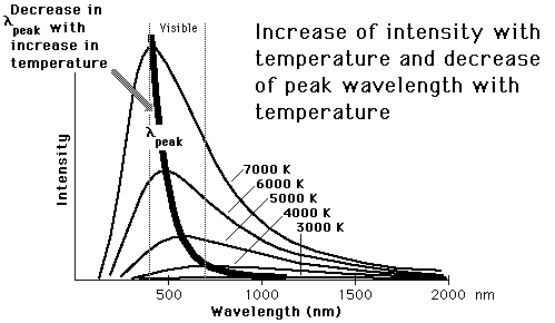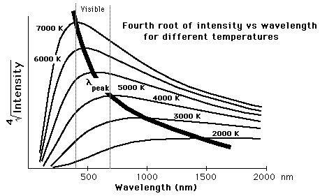 Radiation Curves![]() The wavelength of the peak of the blackbody radiation curve decreases with increasing temperature according to Wien's displacement law. The fourth root of the intensity shows the variation of the wavelength more clearly than the plot of the full radiated intensity. |