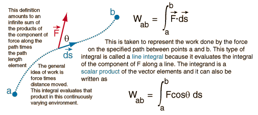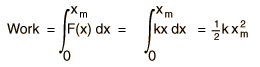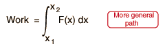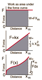 The basic work relationship W=Fx is a special case which applies only to constant force along a straight line. That relationship gives the area of the rectangle shown, where the force F is ploted as a function of distance. In the more general case of a force which changes with distance, the work may still be calculated as the area under the curve. For example, for the work done to stretch a spring, the area under the curve can be readily determined as the area of the triangle. The power of calculus can also be applied since the integral of the force over the distance range is equal to the area under the force curve: