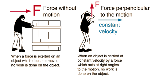 When a force does no workA force with no motion or a force perpendicular to the motion does no work ![]() These two examples of forces which do no work are paradoxical. You can certainly feel fatiqued when doing either of these, so how can you say that no work is done? In the case at left, no matter how hard or how long you have pushed, if the crate does not move, then you have done no work on the crate. It is sitting still in the same place! Why then do you feel fatigued (as well as frustrated, etc. ). The resolution to this dilemma comes in considering that when your muscles are used to exert a force on something, the individual muscle fibers are in a continual process of contracting and releasing to maintain the net collective result of a steady force on an external object. That contracting and releasing involves force and motion, and constitutes internal work in your body. The energy shows up as warming in your muscle tissue, but if the crate doesn't move, there is still no net work on the crate. The example at right is another standard paradox in the definition of work. If the box is being carried at constant velocity, then no net force is necessary to keep it in motion. The force exerted by the person is an upward force equal to the weight of the box, and that force is perpendicular to the motion. If there is no motion in the direction of the force, then no work in done by that force. Yet you certainly feel like you are doing work if you carry a heavy box. The resolution of the paradox is similar to the first example - your muscles must maintain an extra tension to stay upright under the load. This requires a greater amount of internal contraction and release of our muscle fibers, and hence internal work in our bodies. But the work done on the box is zero since by moving in a straight line at constant speed, it's energy is remaining the same. There are many important examples of forces which do no work because they act perpendicular to the motion. For circular motion, the centripetal force always acts at right angles to the motion. It changes the direction of the motion, but it does no work on the object. This can be applied to any circular orbit. |